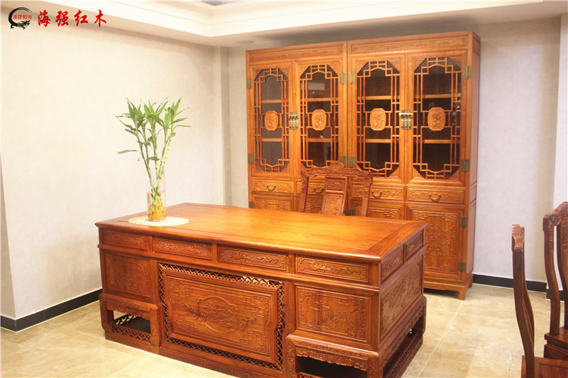 書桌正面:可以看出緬甸花梨木的虎皮紋。