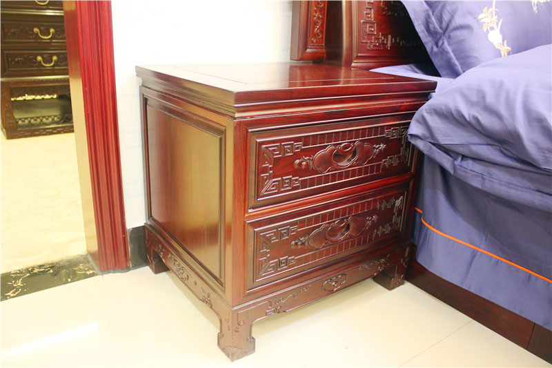 床頭柜上下兩個抽屜,與床箱雕刻相統一,手工打磨的元寶型凹槽拉手,貼合手部,手感細膩光滑,內彎馬蹄足,敦實有力,穩定性好。